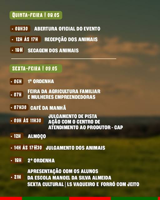 Durante os três dias de festa, os participantes poderão acompanhar uma série de atividades como recepção e exposição de animais, torneio de leite, concurso do queijo, ordenha, julgamento de pista, além de uma agenda técnica com palestras, oficinas e atividades de formação para o fortalecimento da cadeia produtiva.