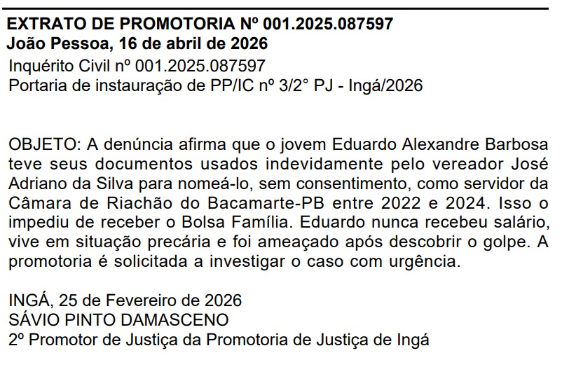 O Ministério Público da Paraíba instaurou uma investigação sigilosa para apurar uma grave denúncia envolvendo a Câmara Municipal de Riachão do Bacamarte, no Agreste do estado. O caso trata do suposto uso indevido de dados pessoais para a nomeação irregular de um servidor.